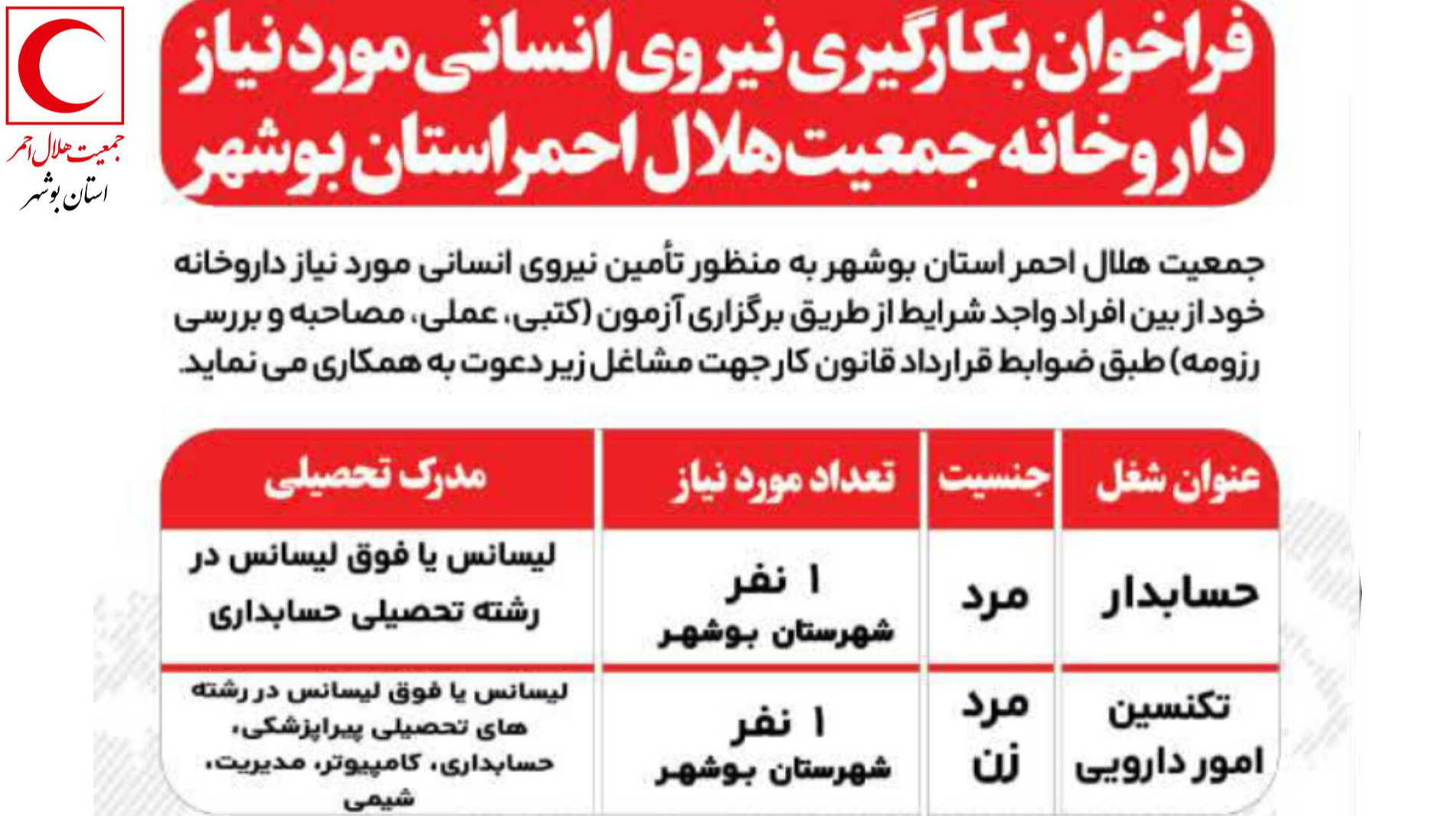جمعیت هلال احمر استان بوشهر جهت تکمیل نیرو مورد نیاز داروخانه اقدام به فراخوان جذب نموده است.